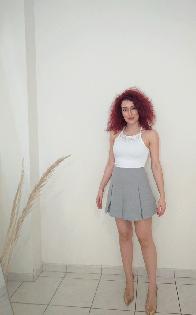 Φούστα μίνι με ραμμένο σορτσάκι εσωτερικά σε γκρί χρώμα. Διατίθεται σε small και medium.
