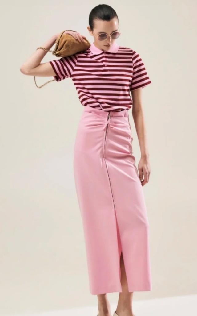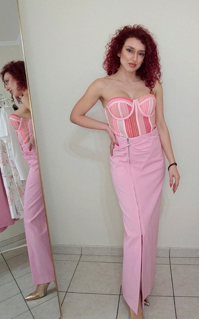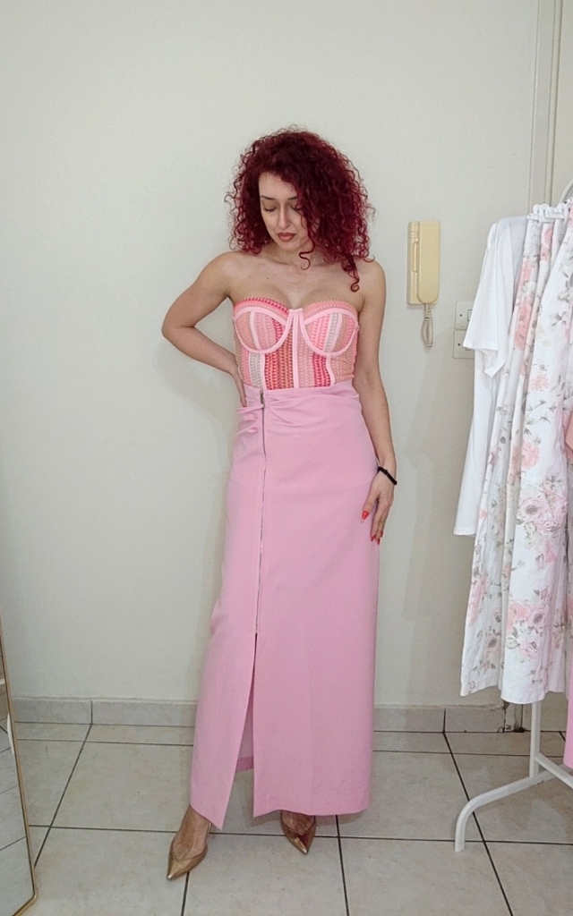 ΜΑΚΡΙΑ ΦΟΥΣΤΑ ΜΕ ΦΕΡΜΟΥΑΡ ΣΤΟ ΜΠΡΟΣΤΙΝΟ ΜΕΡΟΣ . ΣΕ ΡΟΖ ΑΠΟΧΡΩΣΗ. ΔΙΑΤΙΘΕΤΑΙ ΣΕ ΔΥΟ ΝΟΥΜΕΡΑ SMALL ΚΑΙ MEDIUM. 78% POLIESTER 18% VISCOSA 4% ELASTAN